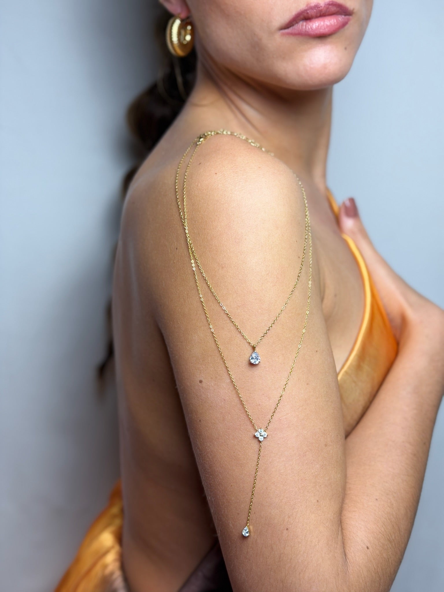 Le collier Stella fin et élégant, chaîne maille doré 1,3mm, avec pendentif étoile 7mm et pendentif gouttes en zircon 3mm. Bijou en acier inoxydable & Doré OR fin 18K.